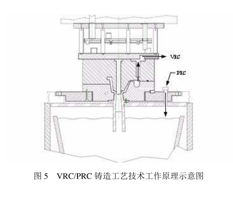 該工藝技術(shù)主要工作原理是:采用一個(gè)變頻真空系統(tǒng)與模具相連接,將模具型腔中的氣體全部抽出,保證金屬液在充型的過程中平穩(wěn)流動(dòng)并且不產(chǎn)生氧化夾雜。當(dāng)鑄型充滿之后,在金屬熔體的表面施加壓力用來凝固補(bǔ)縮,從而保證獲得組織致密的鋁合金鑄件。另外,在金屬模具中設(shè)置多個(gè)水冷回路, 使鑄件形成快速、 漸進(jìn)、 “自頂向下”的定向凝固順序,獲得批量接近零縮孔的鑄件, 并縮短循環(huán)周期, 圖 5 為 VRC/PRC 鑄造工藝技術(shù)工作原理示意圖。