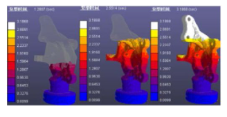 經(jīng)對(duì)轉(zhuǎn)向節(jié)擠壓鑄造過程的數(shù)值模擬,充型過程平穩(wěn),沒有卷氣和成型不良現(xiàn)象,凝固過程也沒有液相孤島存在,如圖14所示。由于有前期東風(fēng)汽車擠壓鑄造鋁合金轉(zhuǎn)向節(jié)的研究工作基礎(chǔ),在廣汽汽車轉(zhuǎn)向節(jié)的擠壓鑄造工藝實(shí)驗(yàn)階段進(jìn)展非常順利。基本實(shí)現(xiàn)一次試模成功。