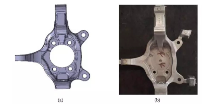 采用A356鋁合金擠壓鑄造工藝生產(chǎn)轉(zhuǎn)向節(jié),根據(jù)乘用車底盤零部件的8種典型工況對(duì)初步結(jié)構(gòu)進(jìn)行強(qiáng)度分析,根據(jù)CAE分析結(jié)果優(yōu)化結(jié)構(gòu),經(jīng)過多輪優(yōu)化最終得到鋁合金轉(zhuǎn)向節(jié)優(yōu)化數(shù)模和鑄件如圖1(a)、1(b)所示,重量為2.19Kg,減重比例達(dá)56.6%。
