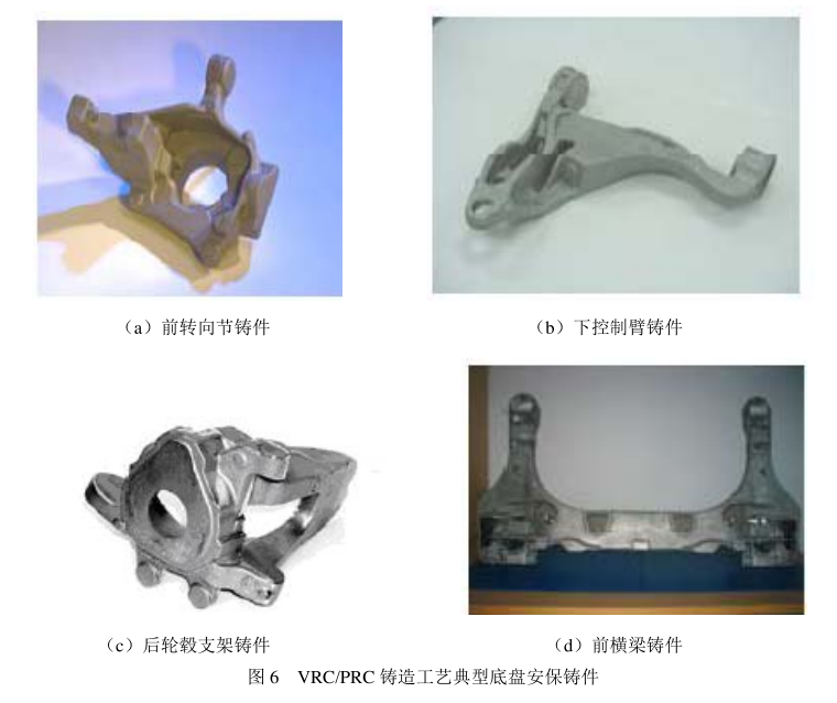 Aloca 公司已利用該工藝技術(shù),建立了具備批量生產(chǎn)能力的自動(dòng)鑄造單元,生產(chǎn)了近 4000 萬個(gè)汽車底盤安保鋁合金鑄件,如控制臂、轉(zhuǎn)向節(jié)、輪廓支架等,如圖 6 所示,已被應(yīng)用于福特、通用等多種車型,獲得了很好的減重和使用效果。