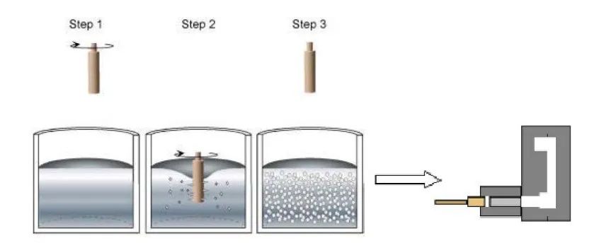 國外根據(jù)半固態(tài)制漿原理開發(fā)出了多種制漿工藝,并結(jié)合壓鑄工藝和擠壓鑄造工藝,形成了多種半固態(tài)流變成形工藝技術(shù),如美國麻省理工學(xué)院開發(fā)的“攪拌式流變成形技術(shù)”(簡稱 SSR)、日本 UBE 公司開發(fā)的“傾斜板澆注式流變成形技術(shù)”(簡稱 NRC)、加拿大 Alcan 公司開發(fā)的偏旋熱焓平衡式流變成形工藝(簡稱 SEED)等,利用這些工藝開發(fā)出多種汽車底盤安保鋁合金鑄件。其中,美國麻省理工學(xué)院開發(fā)的SSR 工藝是目前較為成熟的半固態(tài)流變成形工藝,下圖是該工藝流程圖,首先將低過熱度的合金液澆注到制備坩堝中,利用石墨攪拌桿對(duì)坩堝中的合金液進(jìn)行短時(shí)弱機(jī)械攪拌,使合金熔體冷卻到液相線以下;然后移走攪拌器,待坩堝中的半固態(tài)合金液靜態(tài)冷卻到預(yù)定的溫度或固相分?jǐn)?shù)后,將其傾入壓鑄機(jī)壓室,進(jìn)行流變壓鑄成形 。目前,該工藝已在 Idra 公司實(shí)現(xiàn)了產(chǎn)業(yè)化生產(chǎn)。