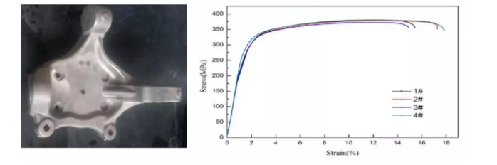經(jīng)對(duì)廣州汽車擠壓鑄造鋁合金轉(zhuǎn)向節(jié)力學(xué)性能測試,結(jié)果如表5;應(yīng)力-應(yīng)變曲線如圖16。