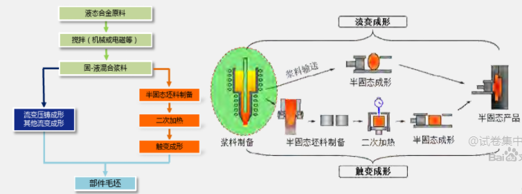 半固態(tài)成型技術(shù)分為兩種類型,一種為“流變成形”,即將半固態(tài)漿料直接進(jìn)行成形;另一種為“觸變成形”,即將半固態(tài)漿料完全凝固成固態(tài)坯料, 再按需要將此金屬坯料分切成一定大小,使其重新加熱至金屬的固液兩相區(qū), 利用半固態(tài)金屬坯料進(jìn)行成形。由于“觸變成形”工藝成本較高,且工藝控制復(fù)雜,目前使用的較少, “流變成形”工藝是應(yīng)用較為廣泛的半固態(tài)成形工藝。