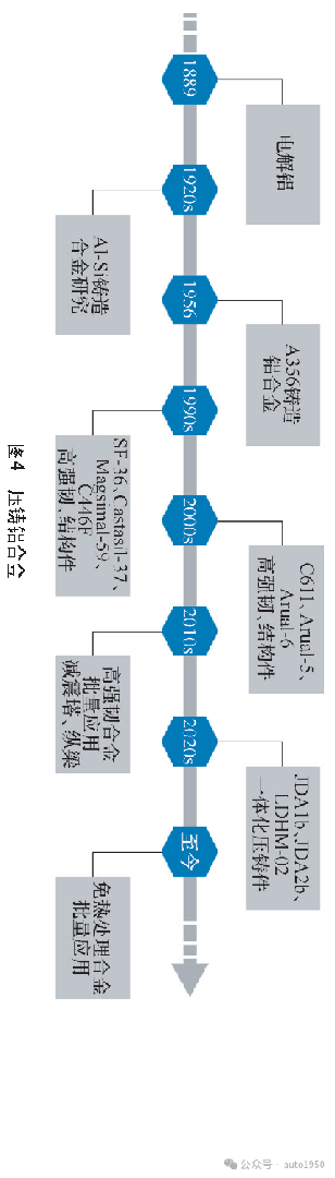 鋁合金的發展史也有百余年(見圖4),在汽車行業的應用也日益廣泛和成熟。據調研[11]表明,車用鋁產品的成型工藝分布比例為:77%鑄件、10%型材、10%板材以及3%鍛件。